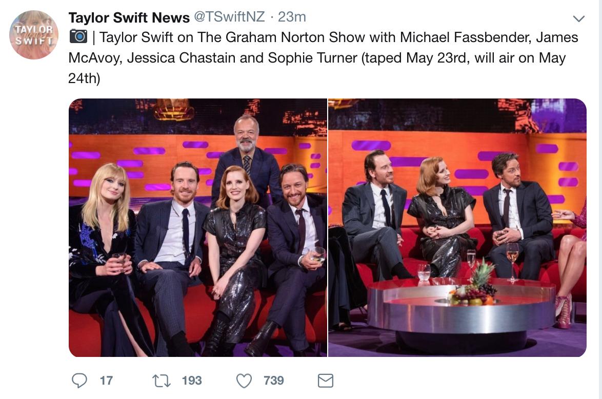 The Graham Norton Show Sophie Turner Michael Fassbender Jessica Chastain James Mcavoy Taylor Swift Tv Episode 2019 Imdb