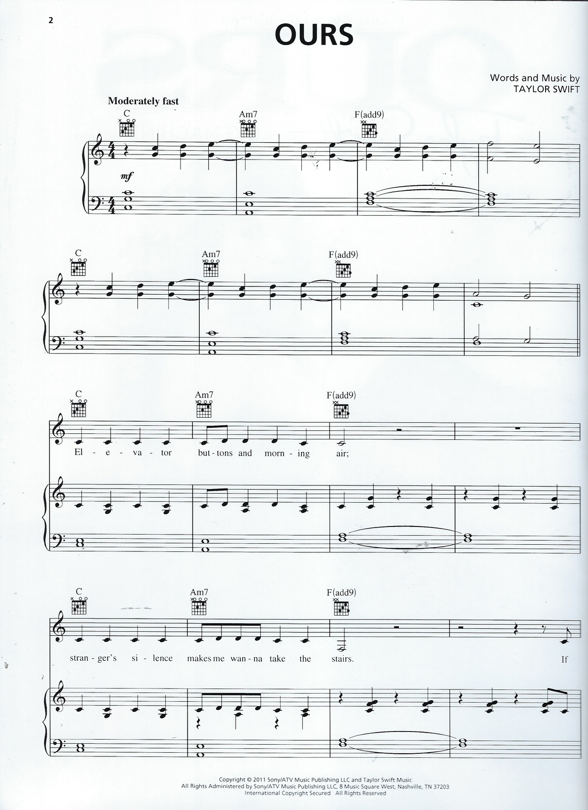 Taylor Swift Ours Sheet Music In C Major Transposable