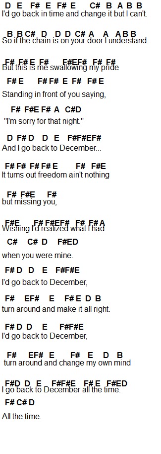 Chord Back To December Taylor Swift Tab Song Lyric Sheet