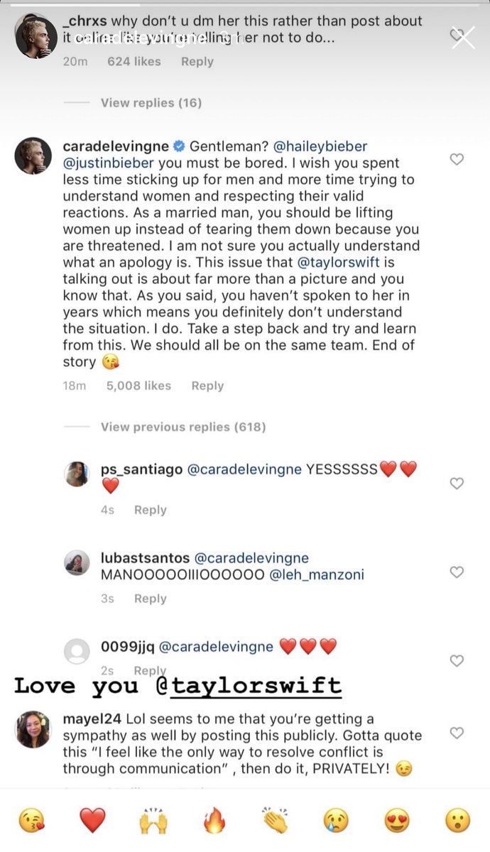 Taylor Swift News On Twitter Ig Cara Delevingne Sharing The Comment She Left To Justin And Hailey Bieber Via Her Instagram Story Westandwithtaylor Https T Co 81rktpianu